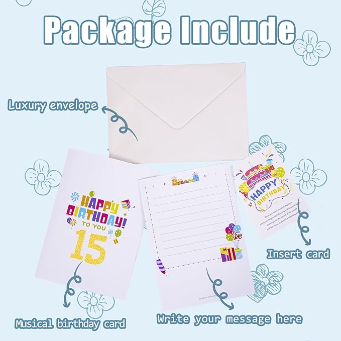 - Lasting Memories on 15TH Birthday: This music card features several flashing modes and colors, and multicolored sparkling lights glow in sync with the birthday song. Combination of audio and visual technology definitely creates a little happy birthday time or send best wishes to girls, boys, daughter, son or other relatives and friends. Classic luxury envelope that is sealable for easy mailing. Also, there is a blank space on the back of the card for you to write your blessing message freely