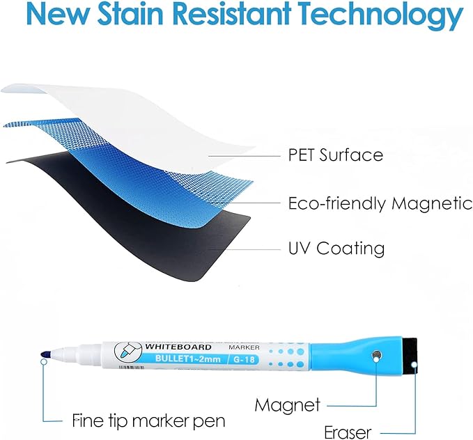 - Easy to Clean Whiteboard: The Whiteboard use PET material that has improved stain-resistant technology. Even after 30 days of writing with markers, words can be easily erased without leaving any stains. This 20''x13'' whiteboard is reusable, so you just need to wipe it clean and then write your plans again.
