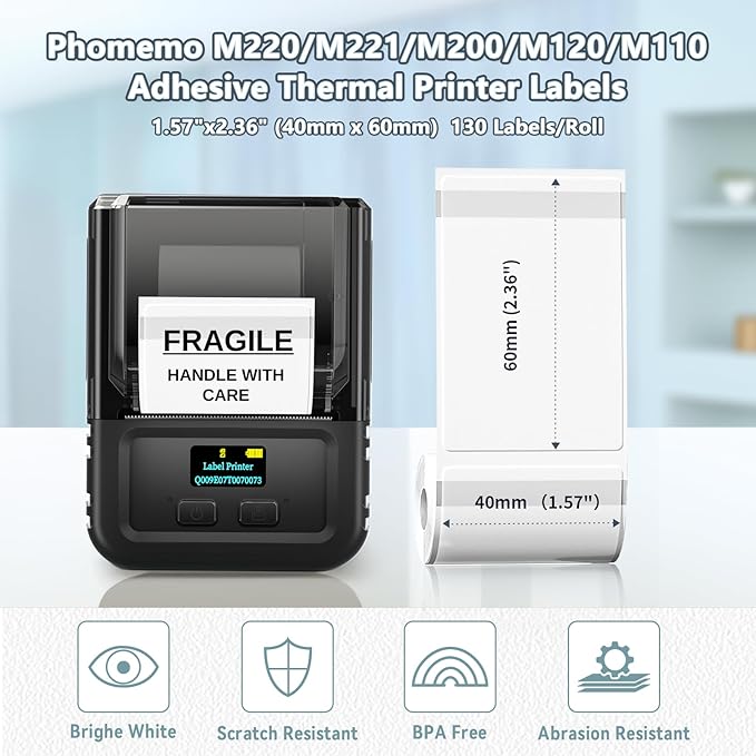 - Compatibility- This thermal sticker label paper is perfect for Phomemo label maker series printers, including Phomemo M120/M110/M220/M150/M250/M221 label maker machines.