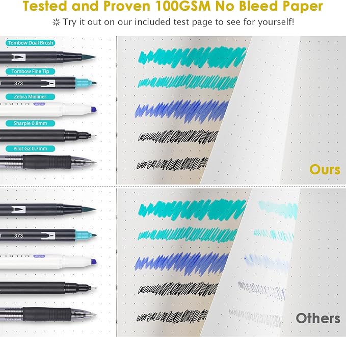 - 【Thick Paper for Writing Without Limits】Large A5 hardcover notebook (5.75"x 8.38"/146mm x 213mm), total 320 pages, includes 312 numbered pages(156 sheets). Each page includes 1107 dots with 5mm spacing: X27*Y41. Our INNOVATIVE PAPER TECHNOLOGY on 100GSM thick paper ensures a perfect canvas for your ideas - no bleed, no ghosting, as confirmed by tests with various pens commonly used in bullet journaling.