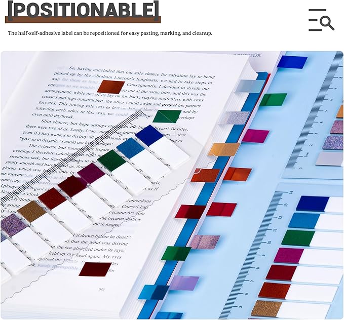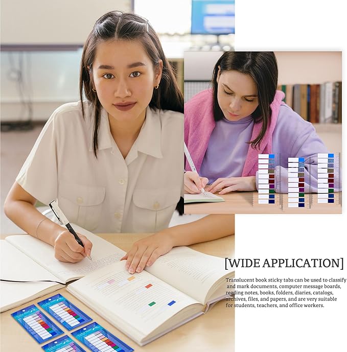 - [WIDE APPLICATION]Translucent book sticky tabs can be used to classify and mark documents, computer message boards, reading notes, books, folders, diaries, catalogs, archives, files, and papers, and are very suitable for students, teachers, and office workers.