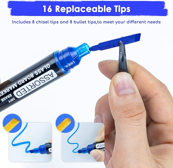 - Long-Lasting Performance: With liquid ink and double the amount compared to regular markers, our chisel tip dry erase marker have an extended lifespan; Each marker set also comes with 16 replaceable tips, saving you money in the long run