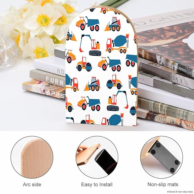2 Pack Wood Bookends, Cars Excavators Pattern Non-Skid Book Ends for Heave Books, Decorative Bookends for Shelves Desk, Book Stoppers Book Holders for Home Office Library School