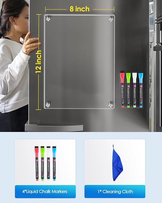 - Super Valuable Sets:1 * samll fridge whiteboard(12"X 8"), 4* magnetic chalk liquid markers and 1* Cloth . Ideal complete set for home, office, kitchen, or classroom.Perfect gift for your family, adults, teenagers, etc.