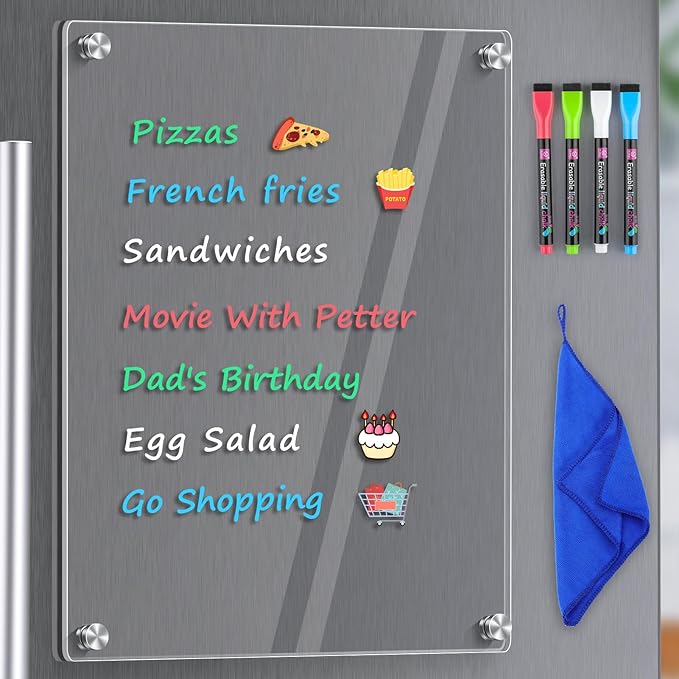 - Anti-sliding/scratch & Powerful Magnetic Design: Four Powerful magnets keep the acrylic dry erase board secure without scratching your fridge, even during opening and closing.(Note: this clear whiteboard is not suitable for non-magnetic stainless steel fridges or curved fridges/refrigerators.)