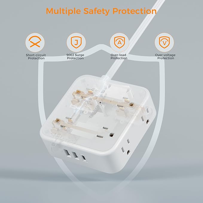 - Surge Protector Power Strip 900J: Equipped with overload protection, short-circuit protection, over-current protection, and etc; The on/ off switch can automatically shut off to protect your expensive computers, tv, or other electronics, providing a safe and reliable charging environment