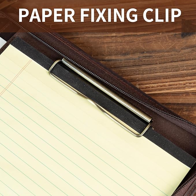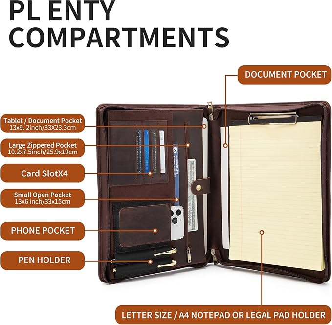 - MULTIFUNCTIONAL ORGANIZER FOR BUSINESS PEOPLE – With rationally designed multi-compartments and pockets in different sizes, our leather folder portfolio accommodates and organizes all your business essentials such as legal pads, loosen leaves, pens, cell phone, tablet, With the robust zipper closure, you can keep your stuffs safe and neatly organized inside the pad folio.Right side writing pad holder is designed for letter size (8.5” X 11.0”) replaceable notepad, spring clip.