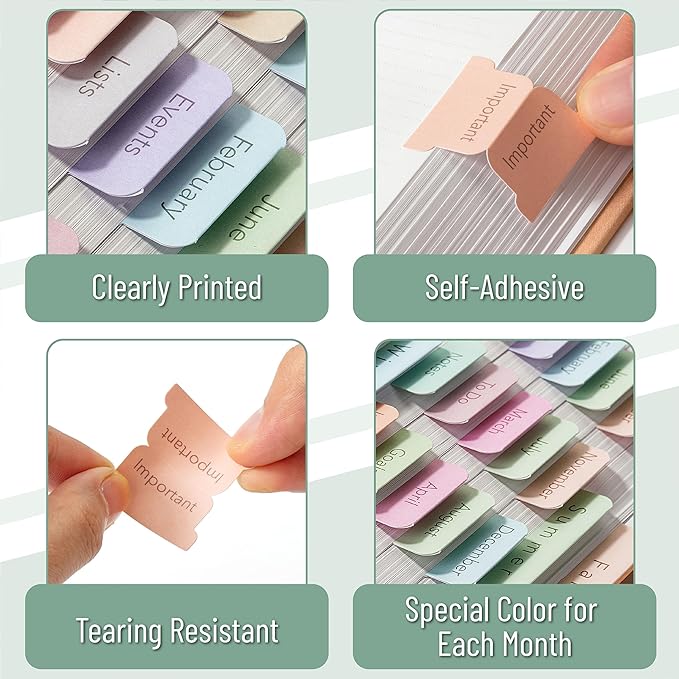 - These tabs come in gentle pastel hues, each color dedicated to different months and purposes, aiding in quick identification and adding visual appeal to your organizer.