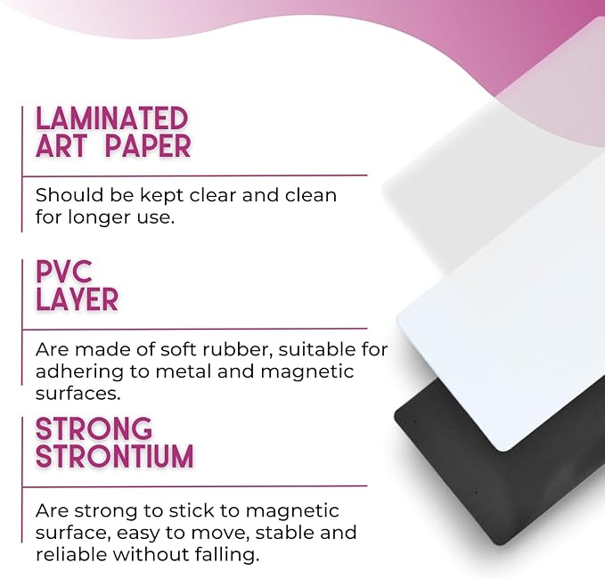 - High-quality Material: The magnetic dry-erase labels have a white writable front, made of laminated art paper, dry-erasable, and a 0.04 inches thickness strontium magnet, on the back for a powerful adhesion to various surfaces; Each label measures 5 x 3 inches;