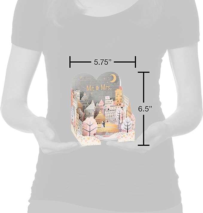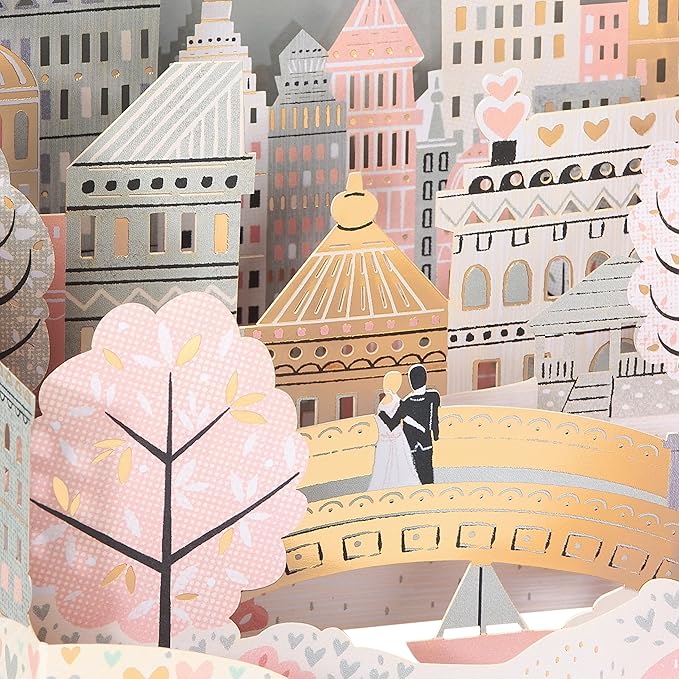 • This decorative Pop-up wedding card features a modern cityscape design with well wishes perfect for a newly married couple to keep on display