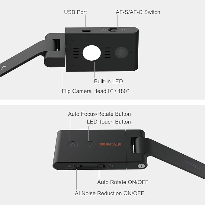 - Document Camera with AI-Noise Reduction Technology: The AI-noise reduction microphone filters out background noise during communication, ensuring your voice remains natural, undisturbed, and easy to hear