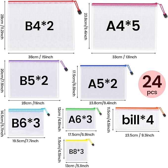 • Multiple sizes:24pcs zipper organizer bags in 8 different sizes and 8 colors, 2*B4(Red), 5*A4(Rose Red), 2*B5(Purple) , 2*A5(Blue), 3*B6(Light Blue), 3*A6(Green), 4*Bills(Orange), 3*B8(Yellow), Get organized with our range of mesh zipper pouches, perfect for pencil pouches, travel pouches, clear storage bags. Available in multiple sizes, these durable and transparent plastic zipper bags will keep your belongings tidy and accessible