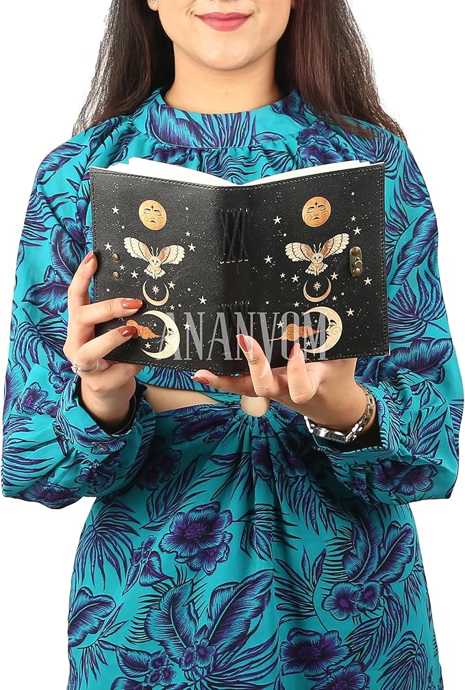 - π Premium Quality Leather: Made from high-quality, eco-friendly leather, this black leather journal is designed to last. The sun and moon embossed design adds a unique, vintage touch.