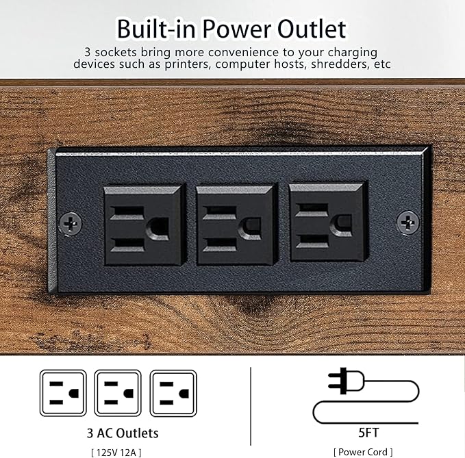 - 【Built-in Power Outlets】The printer table for home office is configured with charging station on the back panel. There are 3 AC outlets, that allows for simultaneous charging of the printer, computer host or shredder, and your laptop. We provide 5ft length power cord for your flexible use of position.
