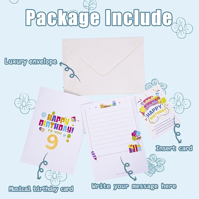 - Lasting Memories on 9TH Birthday: This music card features several flashing modes and colors, and multicolored sparkling lights glow in sync with the birthday song. Combination of audio and visual technology definitely creates a little happy birthday time or send best wishes to women, men, wife, husband, other relatives and friends. Classic luxury envelope that is sealable for easy mailing. Also, there is a blank space on the back of the card for you to write your blessing message freely