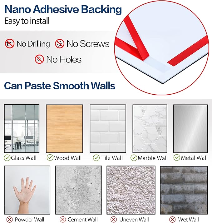 - ✔【Nano Adhesive for Easy Installation】Self-adhesive magnetic display frame with double-sided nano tape, no drilling, damage walls! It can be pasted directly. Super adhesive can be displayed on wall, glass, wood, metal, tile, marble surface for a long time.