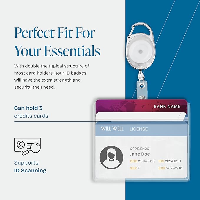 Will Well ID Badge Holders with Clip and Keyring - Horizontal Clear Plastic 3.7" x 2.5" Sleeves Fit Up to 3 Cards - Retractable 24" UHMWPE Fiber Pull Cords - 2-Pack, Transparent White Reels