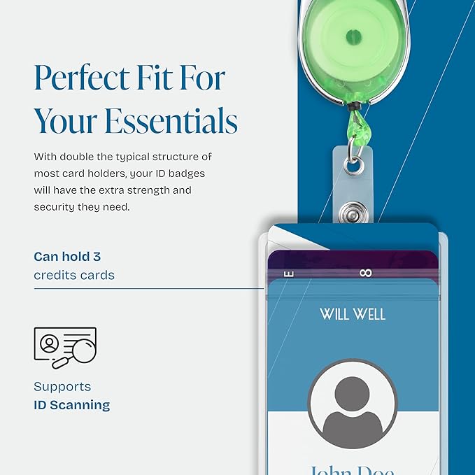Will Well ID Badge Holders with Clip and Keyring - Vertical Clear Plastic 3.7" x 2.5" Sleeves Fit Up to 3 Cards - Retractable 24" UHMWPE Fiber Pull Cords - 2-Pack, Transparent Green Reels