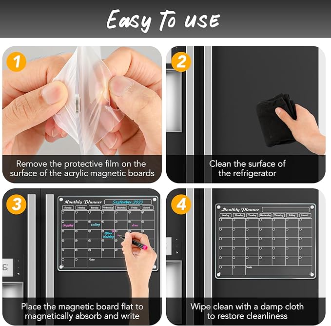 - 【No Drilling & Reusable】Each of our acrylic magnetic fridge calendar is matched with 4 extra thick magnets,You can simply place the acrylic calendar on the surface of the refrigerator and it adhere securely to the refrigerator without the need to drill holes for installation. You can easily move the clear acrylic fridge calendar to other refrigerators and reuse it