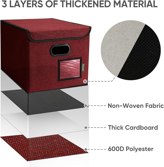 - [OPTIMIZED DESIGN] Designed with convenience in mind, our file storage box helps to elevate your efficiency and organization. The transparent label slot allows for quick identification of the contents stored inside the box. The collapsible design and sturdy handles ensure effortless storage and movement, making it convenient and easy to use.
