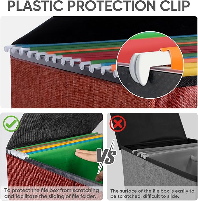 - [UNIVERSAL SIZE] Our file box with lid fits both letter and legal size files. It is designed for efficiency and functionality, with its smooth PVC slide rails on both sides, you can effortlessly slide file folders for easy access and neatly arranged. The lid can fit snugly on the box after hanging folders. (NOTE: file folders are not included)
