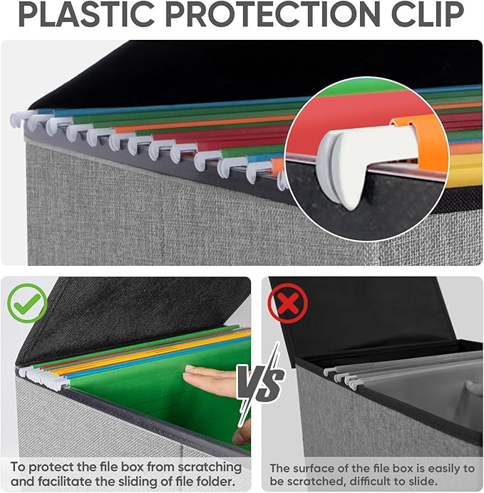 - [UNIVERSAL SIZE] Our file box with lid fits both letter and legal size files. It is designed for efficiency and functionality, with its smooth PVC slide rails on both sides, you can effortlessly slide file folders for easy access and neatly arranged. The lid can fit snugly on the box after hanging folders. (NOTE: file folders are not included)