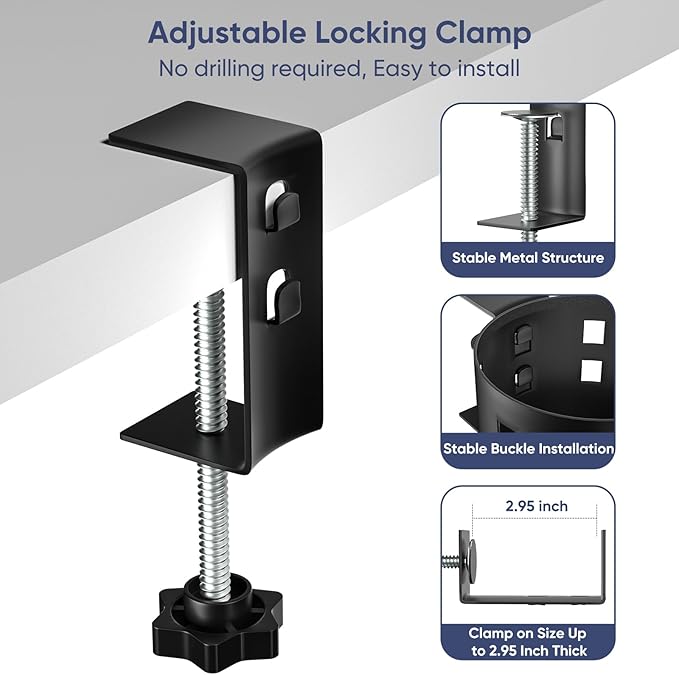 - 【No Drill Needed & Protect Your Desk】 The cup holder with five installation buckles and a clamp mount helps easily install and remove. Simply tighten the black knob downward by hand instead of drilling a hole or paste with glue to the underside of your desk, so leave no damage to your desk. The protective pads between the clips are perfect for preventing scratches on your table and stabilizing the cup holder.