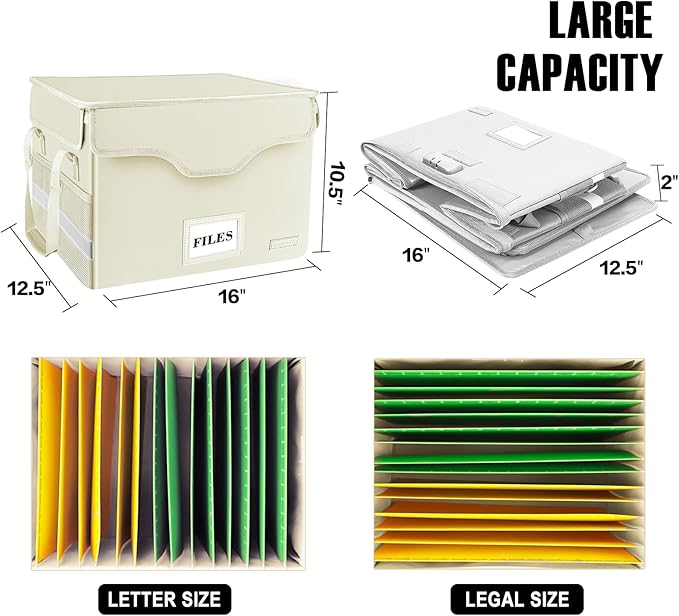 - Large Capacity: 16" x 12.5" x 10.5".Fireproof file cabinet not only can fits both letter and legal size files fitting your filing system, but also can protect your important documents,books,Cards,CDs, DVDs,USBs,albums,passports, social security cards,birth certificates and other valuables because we have designed mesh pockets and tab inserts on the lining of the lid and on the sides of the box.