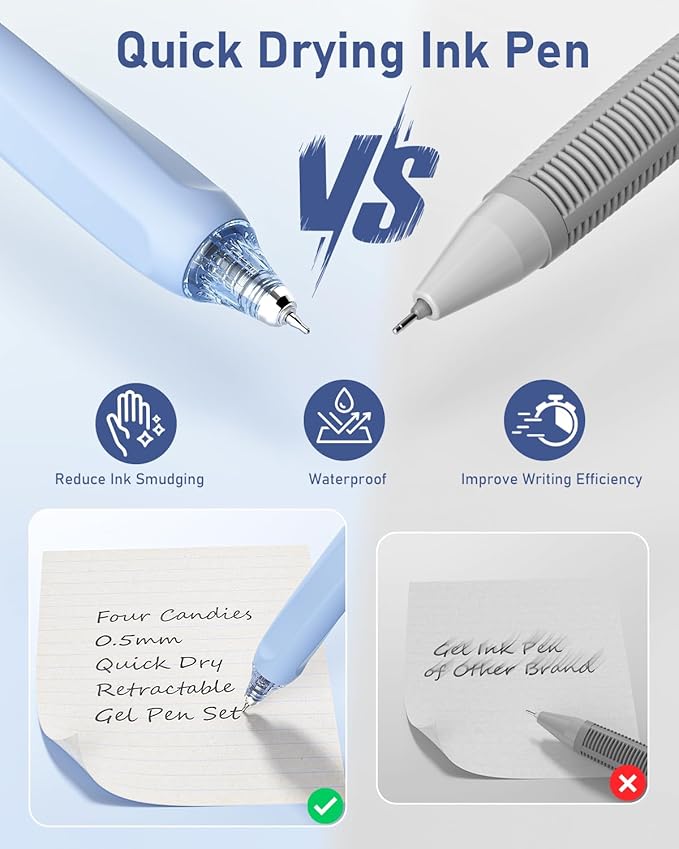 - Premium Quick-Drying Ink: 0.5mm Retractable gel pens with quick-drying ink technology to prevent smudging or smearing and keep the paper clean, it's perfect for left-handed individuals or those who have a habit of trailing their hand while writing. Each nib is sealed with wax to prevent the ink from drying out. Note: The sealing wax needs to be removed before writing