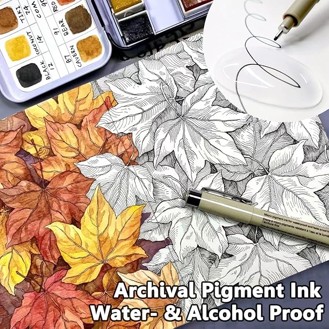- ❤Waterproof Archival Pigment Ink: Don't let bleed and smudges ruin your artwork. Our archival grade ink are no bleed through, no smear, waterproof, fade resistant, quick drying, water-resistant, sun proof, photo safe, non bleeding, acid free, non-toxic, odorless and last long. (Note: The ink will resist water when it's totally dry. This process usually takes a few seconds)
