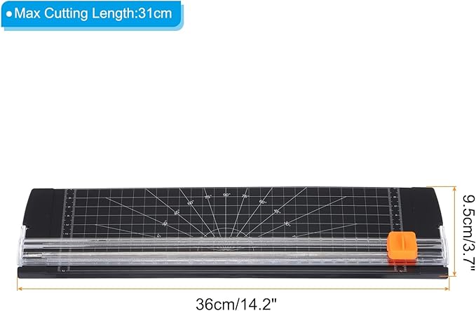 - Specification: Color: Black; Material: Metal, Plastic; Over Size: 36x9.5x2.3cm / 14.2x3.7x0.9' (L*W*H); Max Cutting Length:31cm / 12.2cm; Package List: 1 x Paper Trimmer, 1 x Replacement Cutter Head, 5 x Replacement Blade