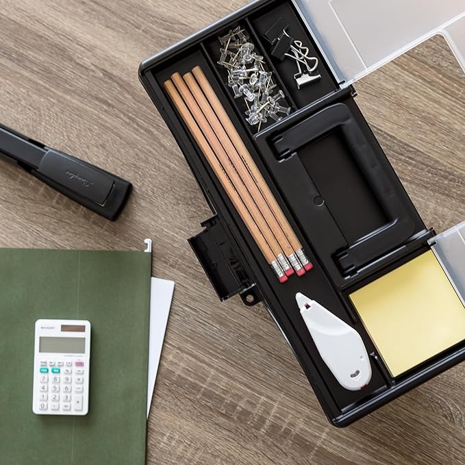 - ORGANIZER TOP - The document organizer's lid features a 4-compartment divider to maximize organization. The versatile compartments come in four different sizes, perfect for storing pens, thumbtacks, clips, and other small office supplies.