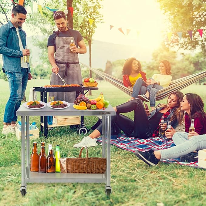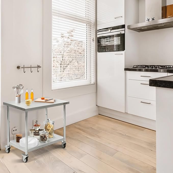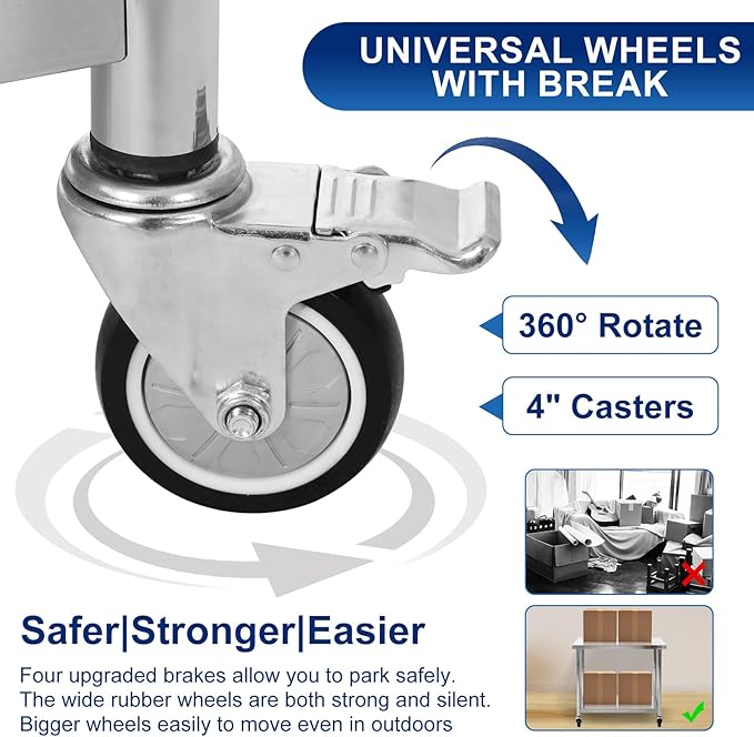 - Heavy Duty: Our metal stainless steel work table with wheels is constructed of thick stainless steel, by attaching auxiliary material to make the table top able to heavy duty. Kitchen prep table have excellent corrosion resistance, durability, ease of cleaning with surface drawing treatment