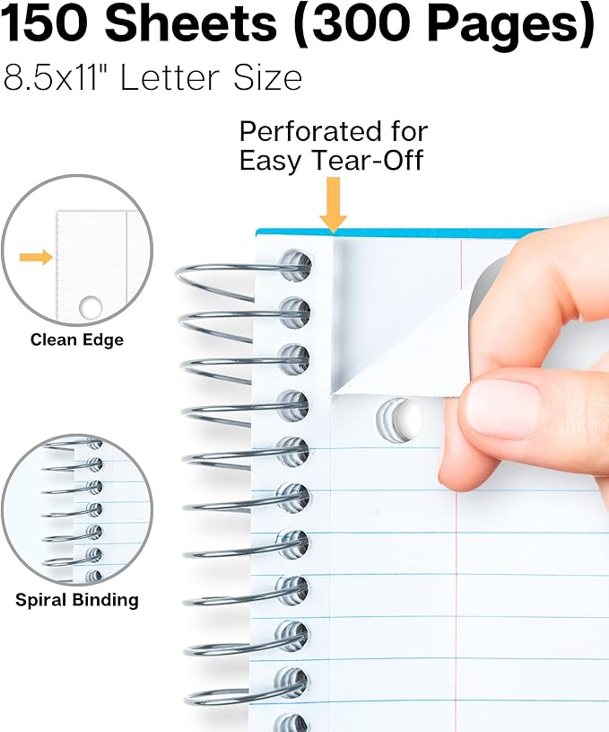 - 150 Sheets (300 Pages) College Ruled Paper: Standard 9/32” width, Take more notes per page. 3-Hole punched, Perforated for easy tear off. Detached paper size: 8-1/2” x 11”.