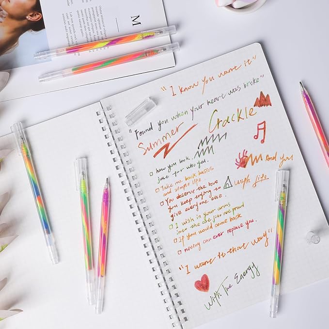 - High Quality -The rainbow gel pens is 5.9inch/15cm and contain a large volume of ink tah can write up to 547 yard/500m.Multi-colored gel pen have fine 0.04inch/1.0mm ballpoint tip perfect for writing,drawing.Rainbow gel pens have more ink than most gel pen,no risk of disclosure, non-toxic and acid-free, as safe as a clam.
