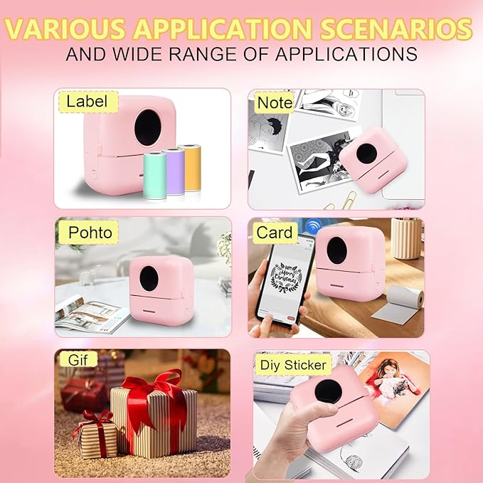 - [Different paper roll gifts] The product includes two rolls of white paper, three rolls of colored paper (blue, pink, yellow), and one roll of self-adhesive paper. Our mini printer enables you to create colorful and adorable patterns. Whether for crafting, scrapbooking, or just adding a personal touch to your items, this printer is the ultimate teaching playmate for your children and a creative tool for anyone looking for inspiration.