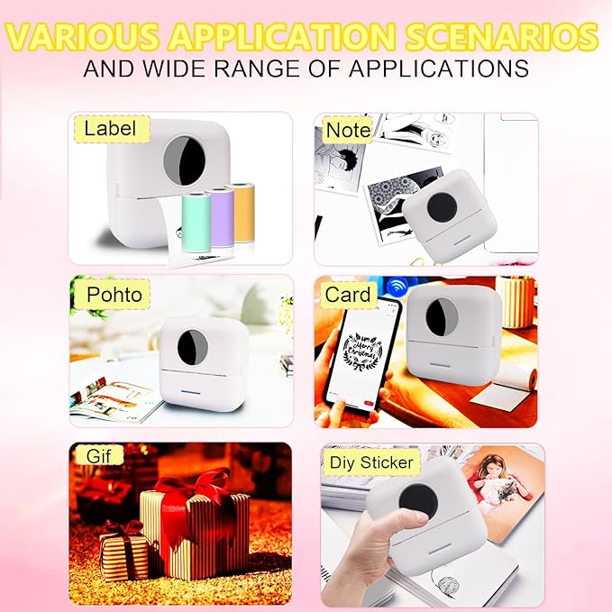- [Different paper roll gifts] The product includes two rolls of white paper, three rolls of colored paper (blue, pink, yellow), and one roll of self-adhesive paper. Our mini printer enables you to create colorful and adorable patterns. Whether for crafting, scrapbooking, or just adding a personal touch to your items, this printer is the ultimate teaching playmate for your children and a creative tool for anyone looking for inspiration.