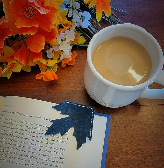 - Unique maple leaf design. Genuine leather corner bookmarks. 4 Beautiful autumn colors. My absolute favorite time of year. Curl up in a big comfy chair beside a warm fireplace with your warm cup of coffee or hot tea and your favorite book and the cool, crisp autumn air outside. These beautiful maple leaf bookmarks will fit right into the corner of your book page to save your page as you gaze outside the window at the autumn leaves as they fall.