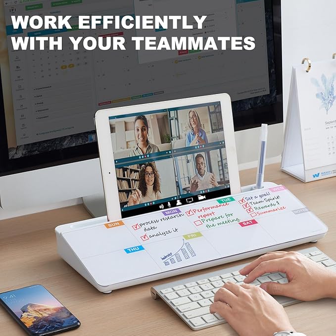 - PERFECT DESIGN: Quickly record your weekly schedule-Sunday through Monday. Maximize your work area. The desktop weekly calendar whiteboard is designed to sit perfectly between a keyboard and monitor and is slope angled for comfortable reading and writing, or typing when you are using it as a keyboard stand.
