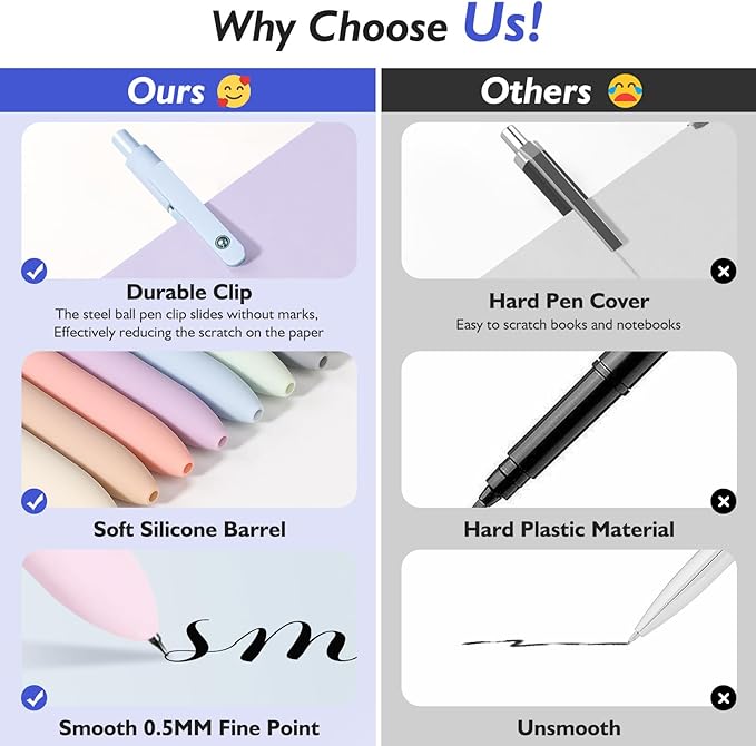 - 【Versatile Use】Whether you're at school, the office, or at home, our gel pens are ideal for all your writing needs, from taking notes, and filling out forms, to doodling, planning, and journaling, making them versatile and suitable for various tasks and projects, you only fasten it to a notebook, binder, or pocket easily. Soft silicone features grip brings a super soft touch feeling which makes each gel pen easy and comfortable to hold. Great for home school office supplies nursing supplies.