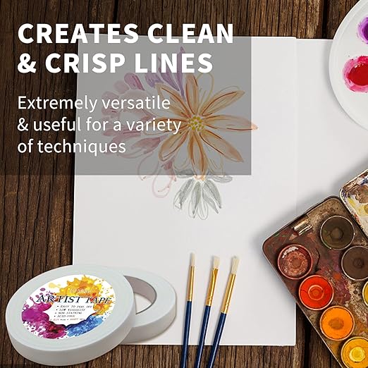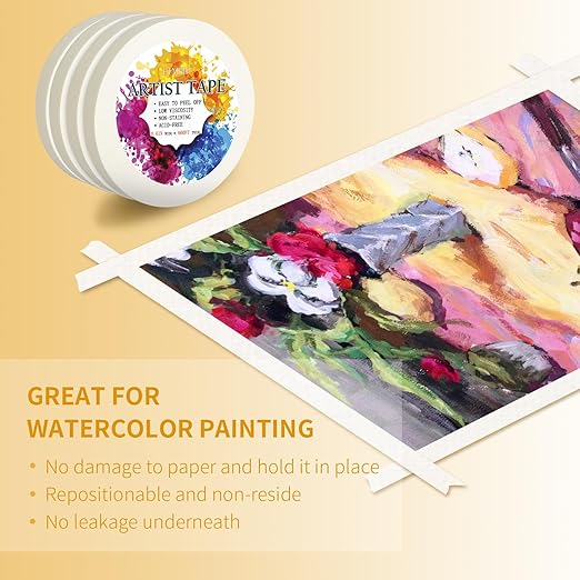 - 【Easy Peeling】The artist tape for watercolor paper is made of crepe paper, it can be torn apart by hand with gentle force. The white tape with low viscosity features that is easy to peel off without any damage to the watercolor paper. More efficient and convenient for painter. Please don't stick/peel this tape on/off paper with a intended strong strength. It is recommended to use in the temperature range of 8-38°C for the best effect. Not recommended for use at temperatures below 0°C. Too low temperature would make the adhesive of the tape low. Too high temperature would cause residue.
