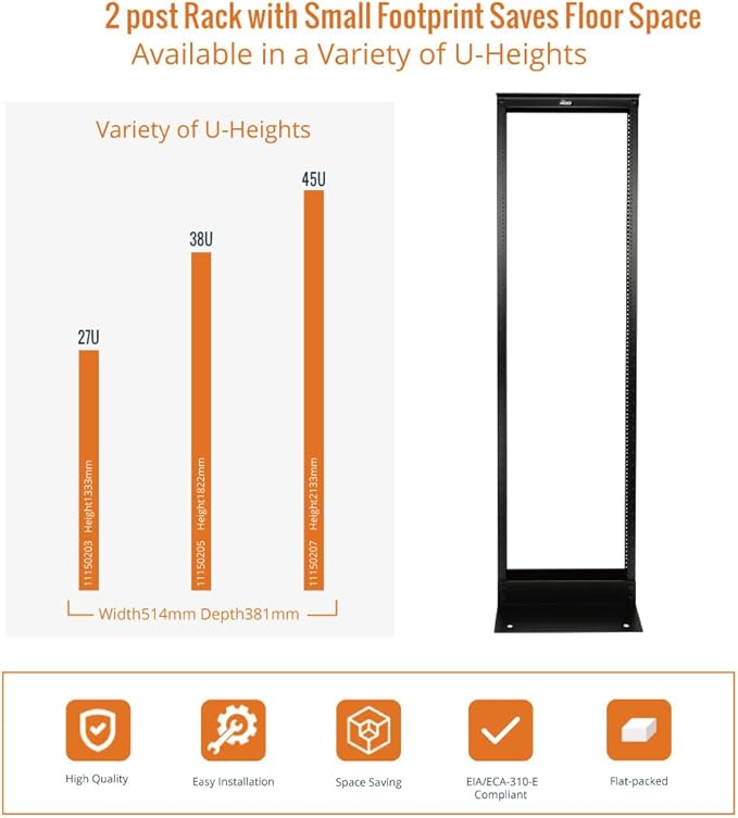 - 【Universal】: EIA/ECA-310-E complaint; Suitable for 19in wide directly installable equipment and rack shelves; Available in 27U, 38U, 45U