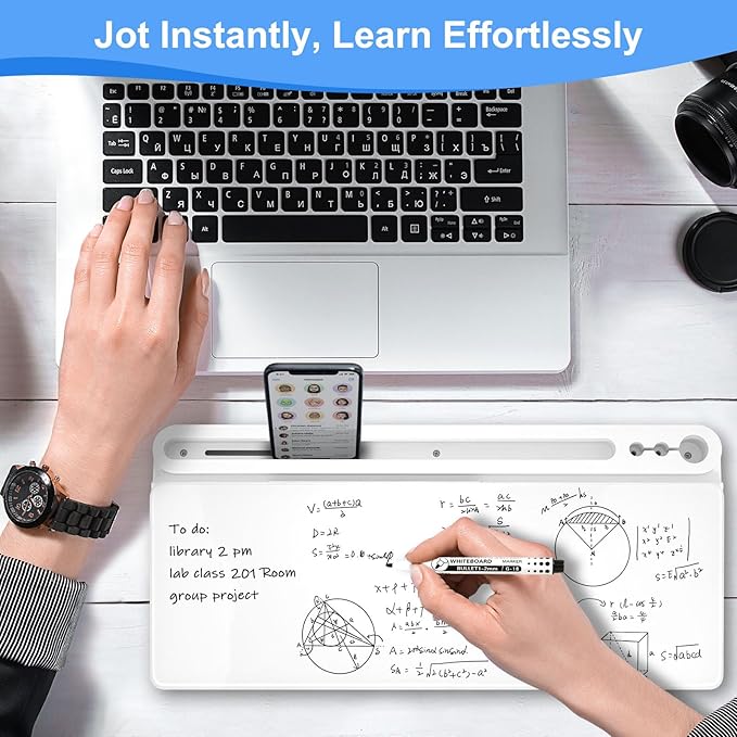 - Multiple Functions - To enhance the overall convenience of the product, this whiteboard includes 1 large pen holder, 2 small pen holders and 1 slot on the top which can hold 3 markers, a tablet and a phone. Equipped with charging port notch in the slot, the desk board is a good option to realize office charging, and you can charge your phone quickly. This dry erase board is more ergonomic with the perfect ramp design and non-slip design, which can make itself be used as keyboard pad.