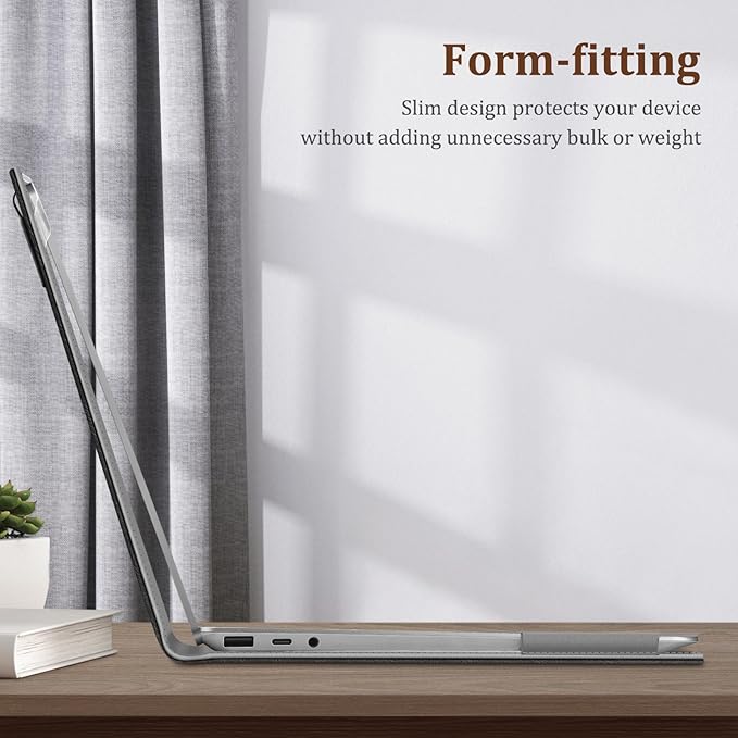 - Premium PU leather surface, soft interior lining, comfortable handing feeling, offers all round protection. Unique protective design allows operating your Surface Laptop freely without removing the case.