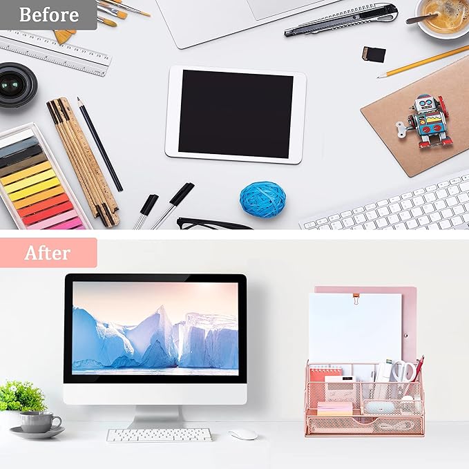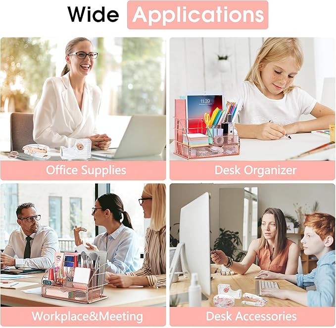 Rose Gold Desk Organizers and Accessories, Office Supplies with Mesh Desk Organizer, Acrylic Tape Dispenser and Stapler, Staples, Ballpoint Pen, Clips Set, Ruler, Scissor, Sticky Labels