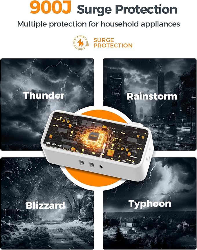 - 900J Surge Protector Outlet: Power strips with surge protection are equipped with short-circuit protection and over-current protection. This long extension cord can protect your electrical appliances from lighting, surges and spikes