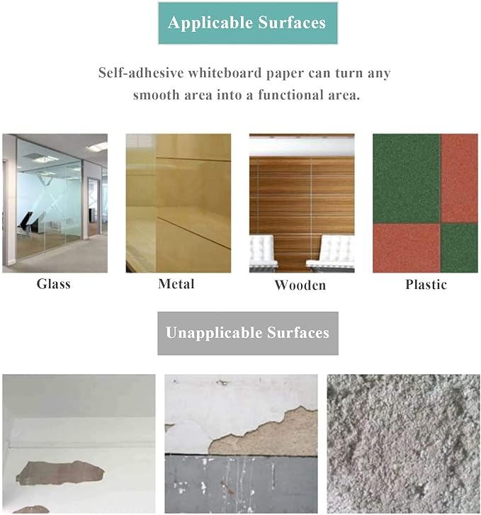 - {EASY TO APPLY} Featuring extreme flexibility and durability, Warasee self adhesive Dry Erase Whiteboard Papers have adhesive on one side allowing you to apply to Any Smooth Surface. Adhere the stickers to smooth surface that can serve as a teaching board in a school classroom or a meeting board in an office, or even stick it on your fridge at home as a list notepad. And no drilling is required, and more importantly, it is free of chalk dust.