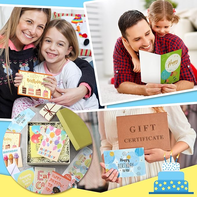 - Suitable Size: our happy birthday cards bulk measure about 4 x 6 inches, with stickers measuring about 1.5 inches in diameter, the size design makes them easily be noticed when guests come to your parties, and meanwhile they will not take up a lot of space