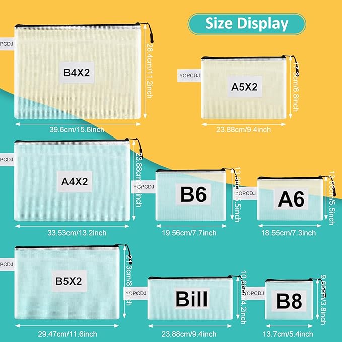 - Package Includes: This 12pcs set includes zipper organizer bags in 8 different sizes, 2*B4 (15.6 x 11.2 inches), 2*A4 (13.2 x 9.4 inches), 2*B5 (11.6 x 8.4 inches), 2*A5 (9.4 x 6.8 inches), 1*B6 (7.8 x 5.6 inches), 1*A6 (7 x 4.8 inches), 1*Bills (9.4 x 4.2 inches), 1*B8 (5.4 x 3.8 inches)