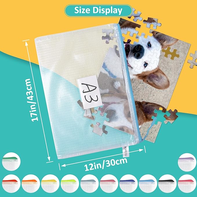 12pcs Mesh Zipper Pouch Bags, Extra Large A3 Puzzle Bag for Organizing, 12 Colors, 12 Packs, Classroom Must Have Storage Bag, File Bags for School, Board Games and Office Supplies
